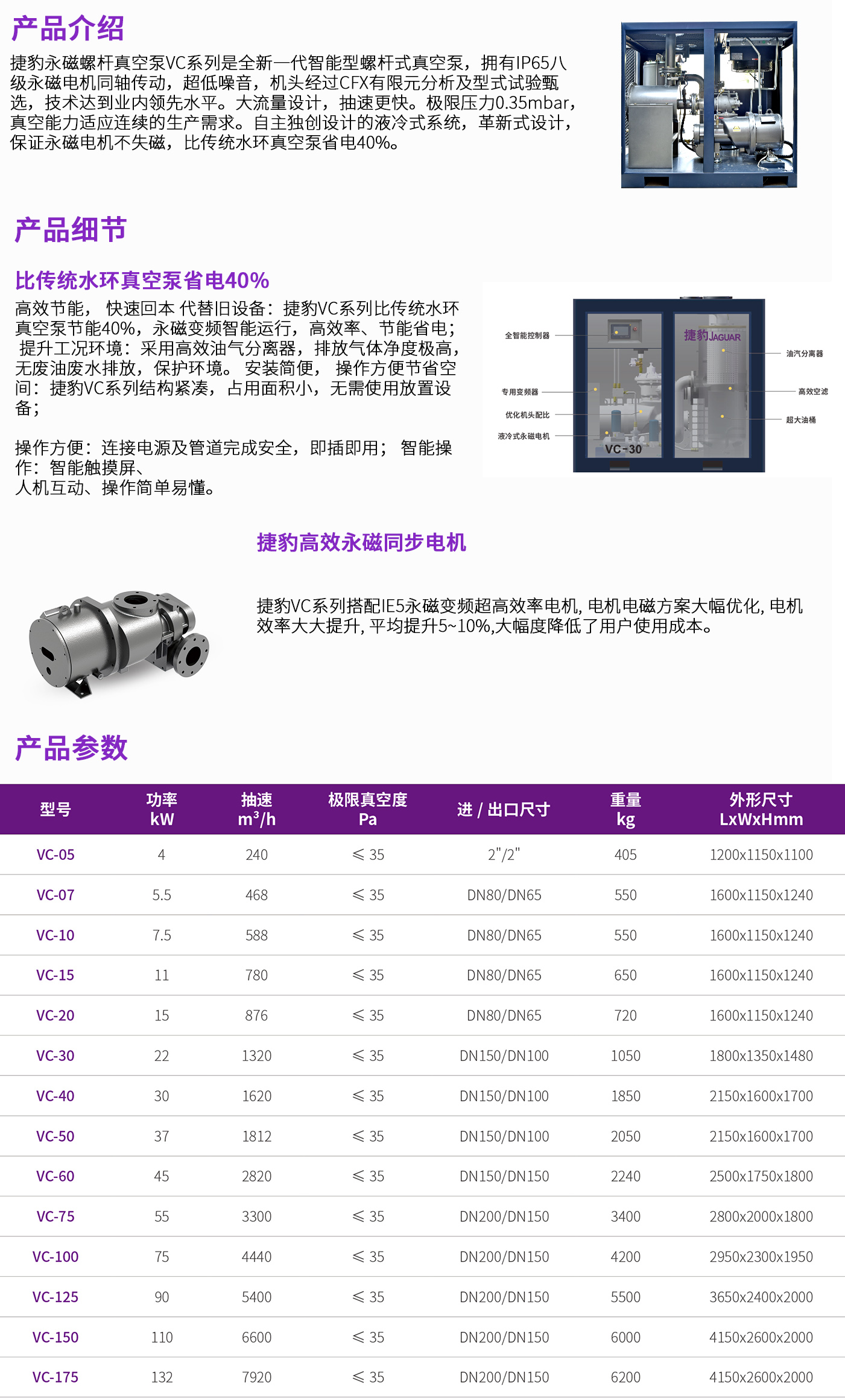 捷豹永磁变频螺杆式真空泵系列产品广泛应用于真空冶炼、电子真空、真空夹持、真空热成型、真空吸附、化学和医药真空制造流程、易拉罐真空罐装等.