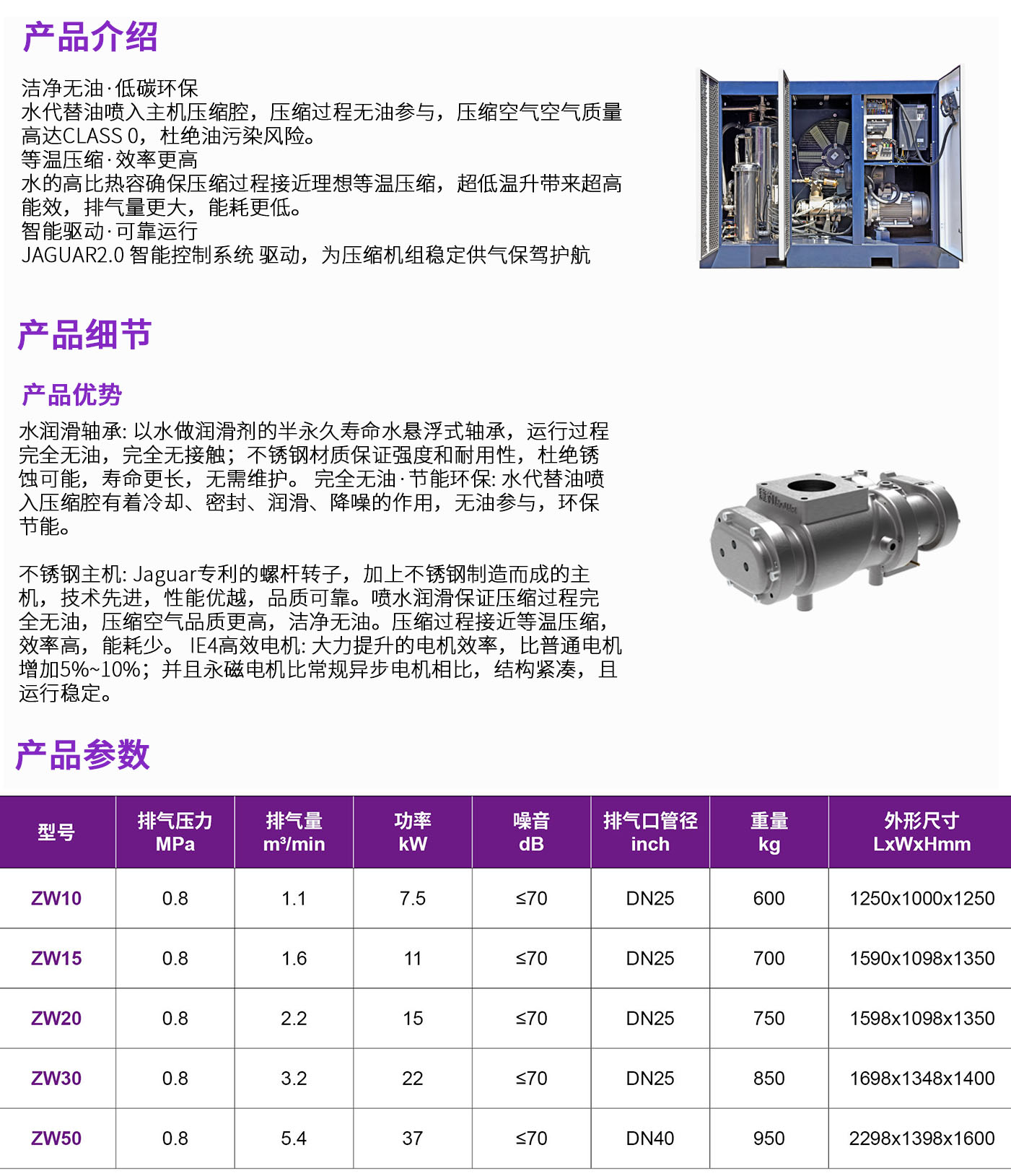 捷豹永磁变频无油水润滑螺杆空压机,完全自主开发设计制造,采用水代替传统的润滑油对主机和轴承进行润滑、冷却、密封和降噪。压缩过程无油参与,压缩空气质量达到CLASS 0。始终如一的超高出气品质,是无油压缩空气的优良选择。压缩过程更接近等温压缩,真正做到高效、环保、节能。