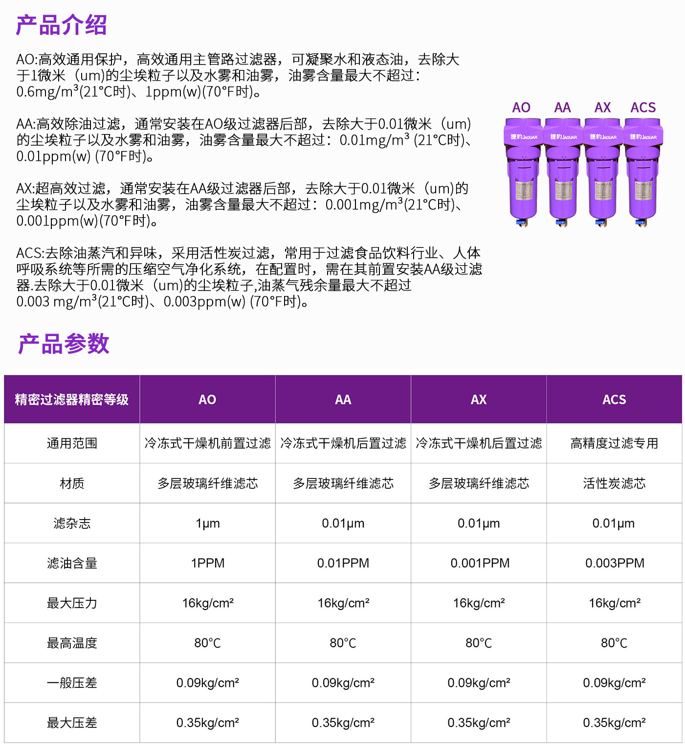 精密过滤器为了能达到高精密过滤品质,采用了捷豹自主研发技术以及多层不同过滤材质,其中包含了硼矽酸盐的纤维层、玻璃纤维层,活性炭层、多层不织布层及不锈钢护网层。使输出的气体真正达到无油,无杂质高品质空气。