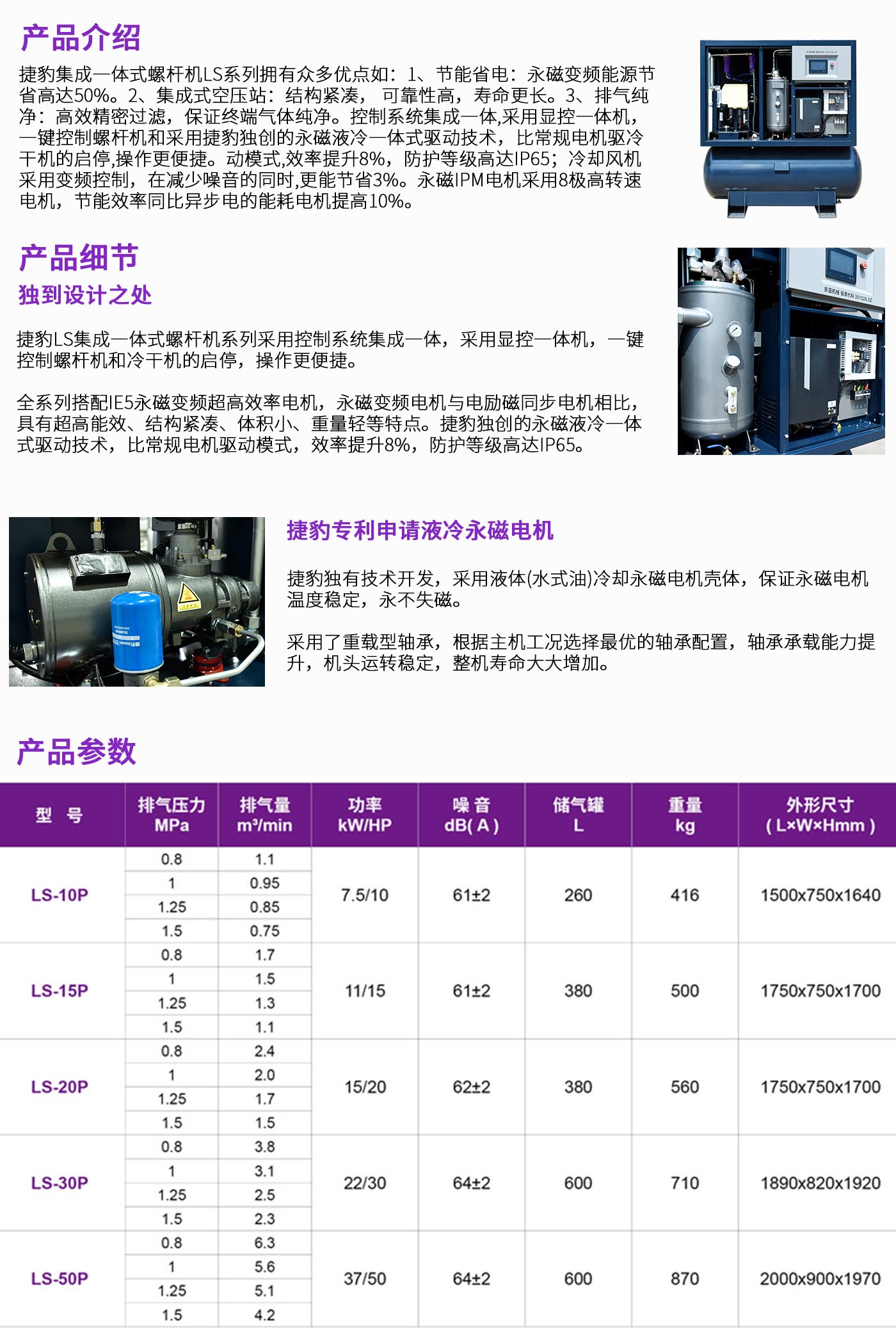 捷豹永磁螺杆冷干一体机具有产气量大、节能、噪音小等诸多优点,较常规机型节省电费50%以上,长期使用下来将为企业节能一笔巨大的能源支出,为社会节能减排贡献力量。